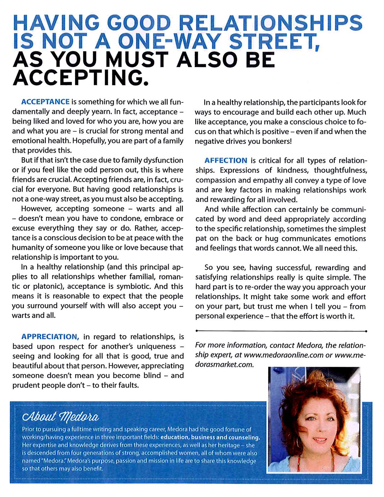 But having good relationships is not a one-way street as you must also be accepting. However, accepting someone – warts and all – doesn’t mean that you have to condone, embrace or excuse everything that they say or do. Rather, acceptance is a conscience decision to be at peace with the humanity of someone you like/love because that relationship is important to you. In a healthy relationship – and this principal applies to all relationships whether familial, romantic or platonic – acceptance is symbiotic. And, this means that it is reasonable to expect that the people you surround yourself with will also accept you – warts and all.
